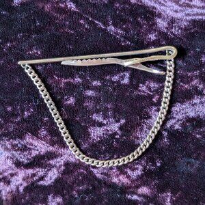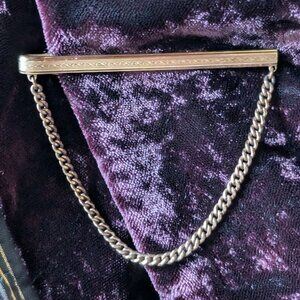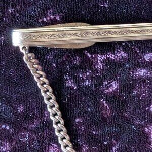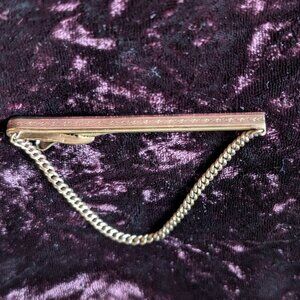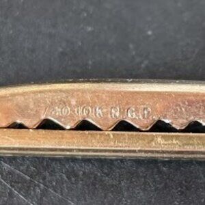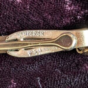 Vintage HICKOK tie bar clip manufactured by a classy designer costume jewelry company during the late 1940s, with an upscale mid-century modern look. Marked "HICKOK U.S.A 1/40 10K R.G.P." on the back and again " 1/40 10K R.G.P." on the alligator clip, which indicates the tie bar and clip are made of base metal covered by 10-karat Rolled Gold Plate, and the gold is 1/40th of the total weight. S. Rae Hickok founded HICKOK Jewelry Manufacturing Co. in 1909 by buying a small jewelry plating business for $350. He led the company's expansion as a major manufacturer of wallets, belts, pants, suspenders, and men's designer costume jewelry. Hickok Jewelry Manufacturing Co was based in Rochester, NY and operated through around 1950. This desirable mid-century costume jewelry gold-plated bar-style tie clip is in excellent condition. It has an embossed classical abstract design that runs horizontally across the front center of the tie bar. The clip measures 2-3/4" long x 3/6" wide, with a 5"-long chain loop that hangs hanging down 2" from it, permanently attached at either end. The alligator press clip is very smooth and secure. Top quality. An outstanding vintage tie bar that would complement any tie, from a well-respected old jewelry company. Wonderful birthday, anniversary, or special occasion gift. The tie bar is a perfect for tie-wearers and could also accessorize scarves, lapels or purses.