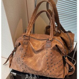 Classic Vintage Wash Brown Vegan Leather Studded large Tote Shoulder Bag