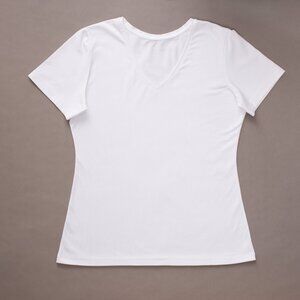 Beautiful White Women’s V-Neck T-shirt. Organic Cotton T-shirt with a touch of Elastane. The fabric is from Turkey and the garment was made in the USA. These t-shirts were designed so you cannot see through the fabric. They are a fitted style and run a bit small. This is a closeout item from a closed company. The retail price was $50. They are available in sizes from small to XXL.