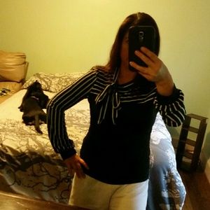 Bell bottom sleeves, fitted top. I clipped it back to show how it looks when formed to body. Top half is striped with bow. Cotton/polyester mix. Tag says Large but it fits M. NWOT
