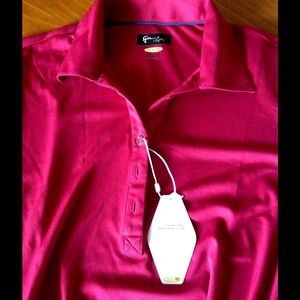 Brand new with tags. From Greg Norman Collection with Play Dry technology. Raspberry color with teal blue trim, 2 side pockets, size medium.