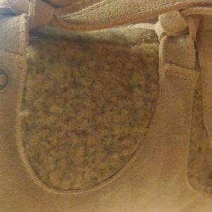 Classic style, shearling lined, mid calf, with boiled wool and decorative tie knot back detail. Never worn outdoors. Like new.