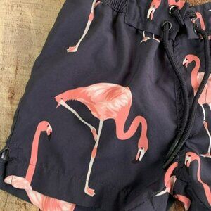 Navy blue swim trunks with a classic club boys design, adorned with pink flamingo prints. Perfect for pool parties or a beach day.