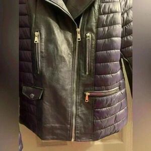 Classic Concepts Womens Jacket in Navy Blue three zippered compartments in front, zippered front closure & each sleeve has zipper. Snap on front is just for looks. Quilted look & center is a leather look but not leather just a contrast. Hand Wash. women’s size XL. SHELL 100% Nylon contrast & lining 100% poly SFPF HOME