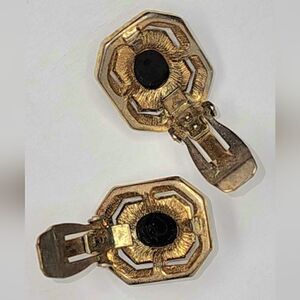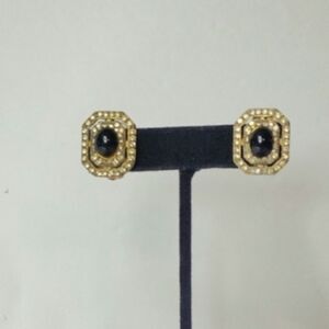 Gorgeous classic gold tone clip on earrings with clear rhinestones and black center cabochon