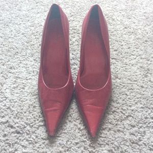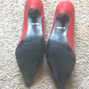 Classic fire engine red heels. Gently used with slight scuff marks on the very tip of the point. Nothing shoe polish couldn't take care of. Other than that, great condition. Size 8