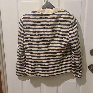 Jacket is black and cream colored horizontal stripe.5 Gold buttons down front with snap to closure.