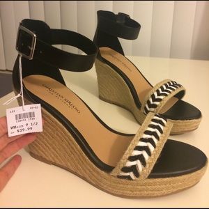 NWT. Classic summery black/white/tan wedge sandals. Adjustable faux leather buckle at the ankle. Bought these on a whim cuz they'll go with anything and they're so cute, but they're a little too tall for me... I've been making a terrible habit of doing that lately haha but, my loss is your gain! Will come with original box (pictured). All offers considered!! 🙂