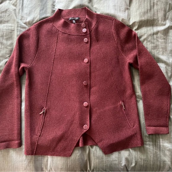 Elegantly styled wool jacket in deep rust which can be worn closed or open. In perfect condition. Front pockets with zippers.