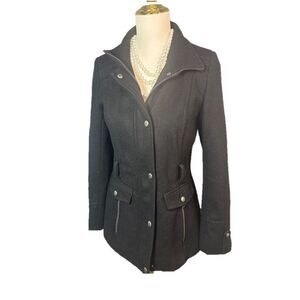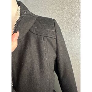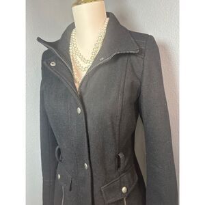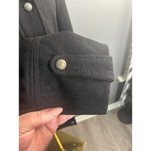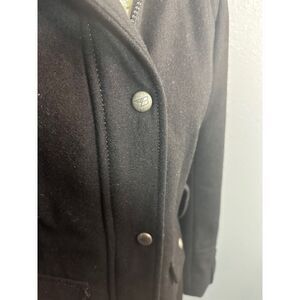 This pre-owned Buffalo women's black coat is made from a wool blend. It features a zip-up front, snap button closures, two zippered pockets, and a collared neckline. The coat is approximately 29 inches in length. The coat does not come with original belt but remains in good condition. Measurements: Shoulder to shoulder 16 inches, sleeve length 25 inches.