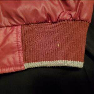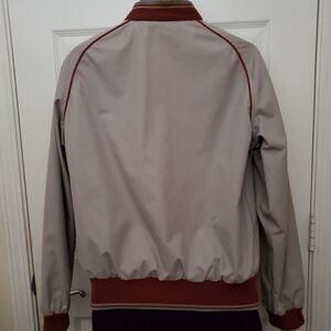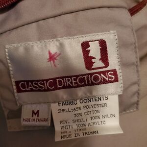 This is a vintage Classic Directions reversible jacket. This throwback jacket has a full zipper up the front. On the light gray side, there are 2 slit hand pockets and 2 zippered hand pockets. On the dark red side, there are 2 slit hand pockets.
