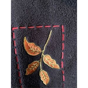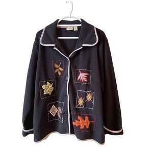 Cute Fall appliquéd jacket is fleecy and warm with a full button front and spare button attached inside. You can roll or turn up the cuffs for a different look. Soft and warm! In VGUC.