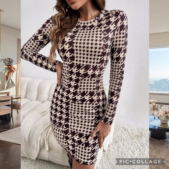 Classic Houndstooth Print Bodycon Pencil Hem Dress