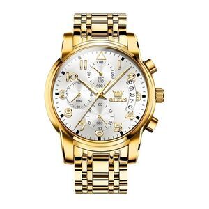 Featuring the gold chronograph dial, 42mm gold-tone case, an ever-practical date display window at 3 o’clock and luminous hands, the watch showcases men's masculinity and glamour. The refined watch graces the men's everyday and dress wear.