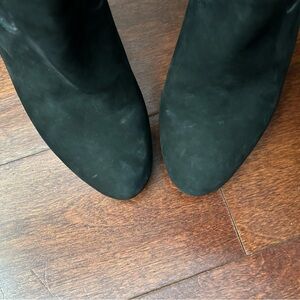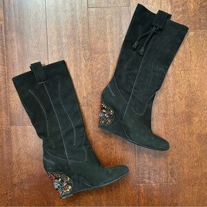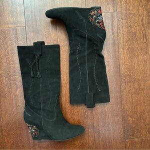 Classical Western Whimsigoth Boho Black Suede Embroidered Wedge Boots, Size 6.5