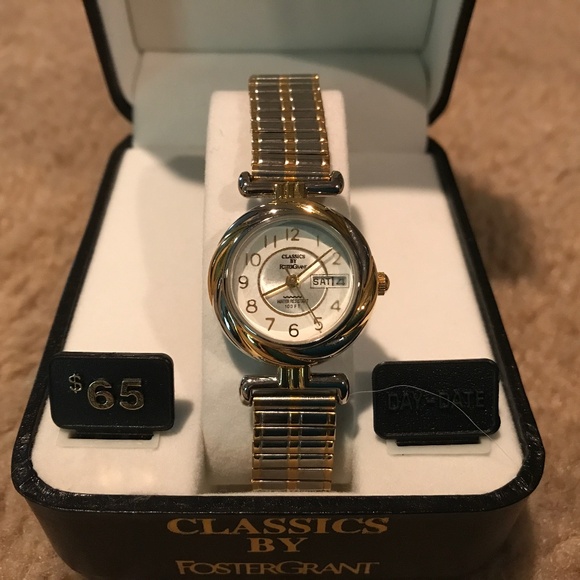 Classics by Foster Grant Women’s Watch. Water resistant to 100 feet. Stainless steel back case. Metal bezel. Needs battery. Flex band.