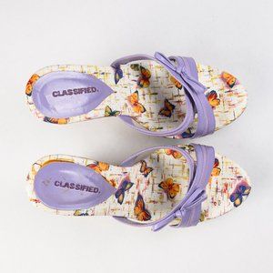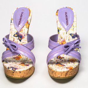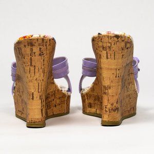 Open toe and back cork wedge heel. Purple straps with bow. See pictures for condition.