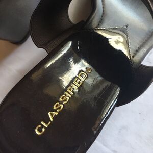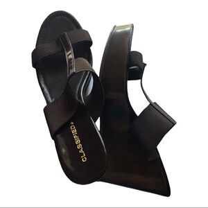 EVC, gently preowned, excellent condition, brown elastic with brown patent strip down center front, shiny wedge, see pics for measurements, Questions? Leave comment below!
