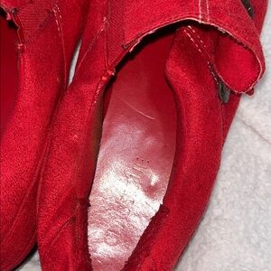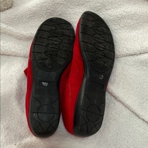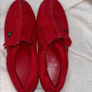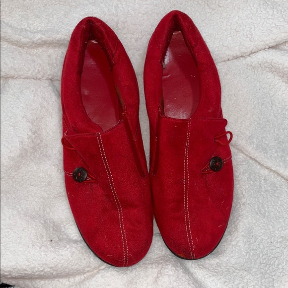 Stylish red loafers featuring a classic button detail. Perfect for adding a pop of color to any outfit.