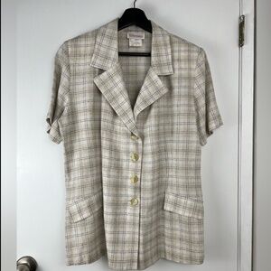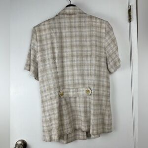 Vintage 80s/90s linen blend short sleeve glen plaid pattern blazer jacket with button front and tab detail on back. Light cream beige with a black stripe. Has shoulder pads.
