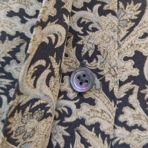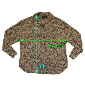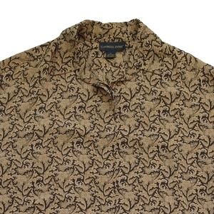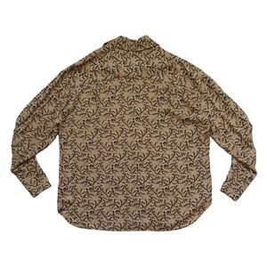 Good used condition, with no stains or tears. A bold brown button-up shirt, with an abstract floral pattern. Collared, with long sleeves and hidden buttons. Comfortable and lightweight as it is pure silk.
