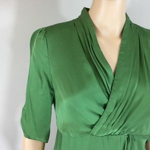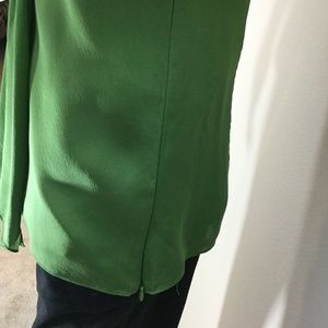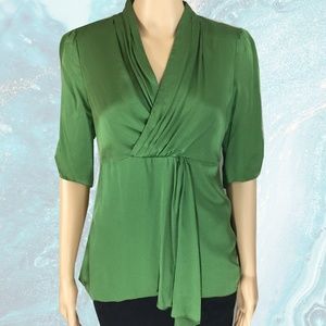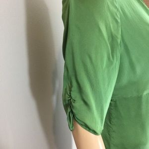 Nordstrom exclusive 3/4 sleeve silk office or work top with v neck and side zipper. Gathered accent at elbow. Little to no stretch.