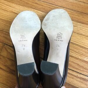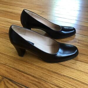 Classic and chic brown pump, block heel, rounded toe, approximate 3" stacked heel, padded leather insole, leather lining, leather sole, smooth Italian leather upper
