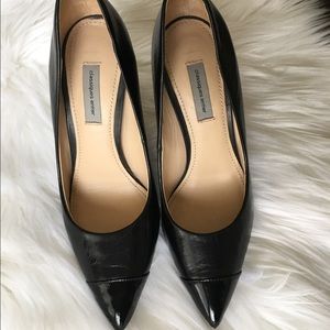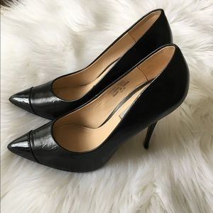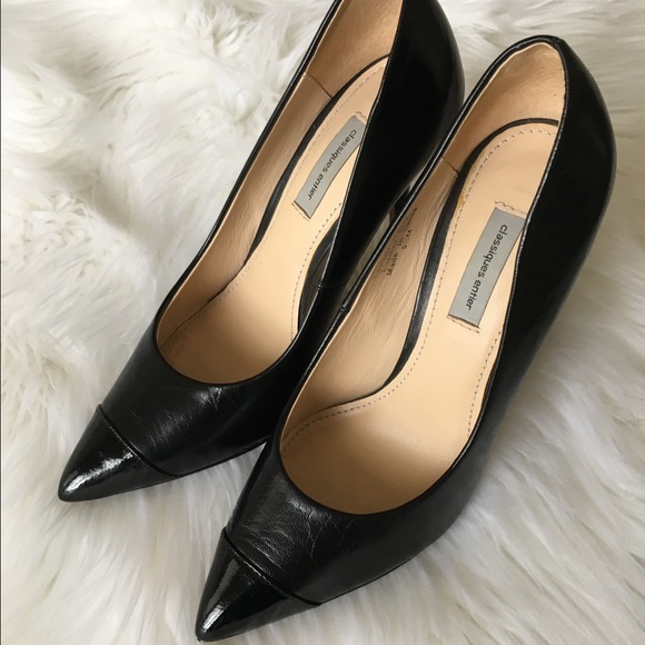 Classiques Entier 'Riley' patent-cap toe pump. Leather upper, lining and sole. Size 5.5M, Approx. heel height: 4". Gently worn, in good condition.