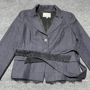 Gently worn, no visible flaws noted. Raw-edge hems on blazer and sleeve cuffs are part of the design. Light creasing to the belt from storage. Overall clean and well-kept.