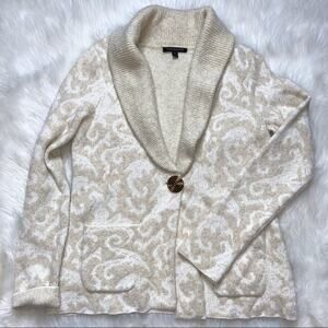 Classiques Entier Atelier Cardigan Sweater Beige with gold metallic, Size Medium, long sleeves, pockets, 1 large gold button