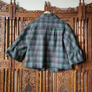 Beautiful, classic mid 2000's twee style jacket in an oversized hounds tooth print. The colors are a forest green, brown, and white. Sleeves are three quarter length with a ruffled sleeve. This semi cropped, cape like shape with the old-money print hearkens back to 1940's style and is something you'd expect to see on Blair Waldorf or Emily Gilmore in an autumn episode of Gossip Girl or Girlmore Girls.