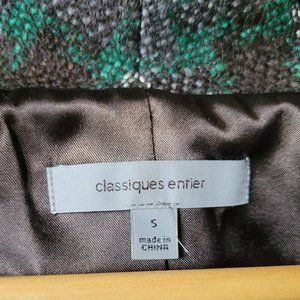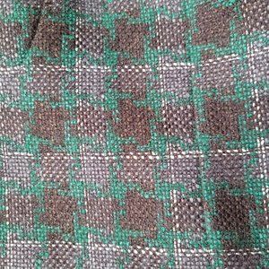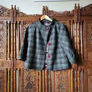 Beautiful, classic mid 2000's twee style jacket in an oversized hounds tooth print. The colors are a forest green, brown, and white. Sleeves are three quarter length with a ruffled sleeve. This semi cropped, cape like shape with the old-money print hearkens back to 1940's style and is something you'd expect to see on Blair Waldorf or Emily Gilmore in an autumn episode of Gossip Girl or Girlmore Girls.