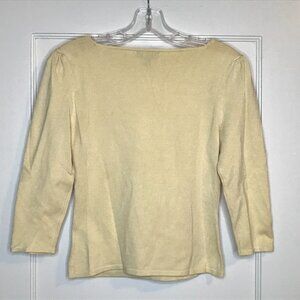 Classic refined sweater in yellow silk-blend knit. Flattering square neckline. Three-quarter length sleeves.