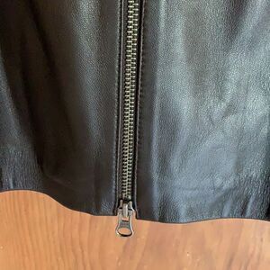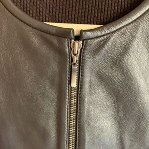Classiques Entier brown ribbed wool jacket with front leather panel and dual front zipper closure. Long sleeves with leather trim along neckline. Excellent Condition