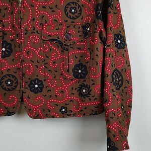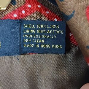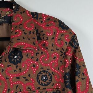 Classiques For Nordstrom Zip Front Cropped Linen Jacket in a red,black, and white floral print on a brown background. This jacket has a collar, shoulder pads, zip front, 2 chest button flap pockets, and rounded hem and side vents. Fully lined in brown acetate. 100% linen. Made in Hong Kong. Size Small.