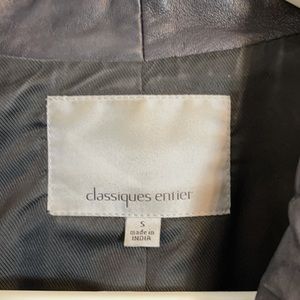 Classiques entier Soft plum colored leather jacket. Slight Asymmetrical Zipper in the front with cute ruffle detail, two front pockets, really great used condition. The tag on the inside has a little bit of discoloration but this does not affect the jacket.