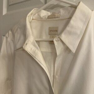 Chico's No Iron White Crisp top which every wardrobe needs. 100% Cotton. Perfect with Jeans or business casual in the office. Button Down, Collar and 3/4 sleeves with folded cuff.