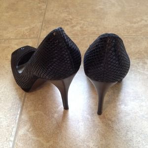 Snakeskin & velvet peep toe. Calvin Klein. Black on black. Fabulous condition -- worn once, indoors! 4 1/4" heel. 1/2" platform