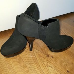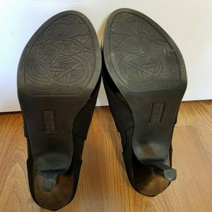 These classy black heels have only been worn one time. They are in excellent condition with only a couple small scuffs, which are barely noticable on the bottom of the heels. The heel is 4'' high.