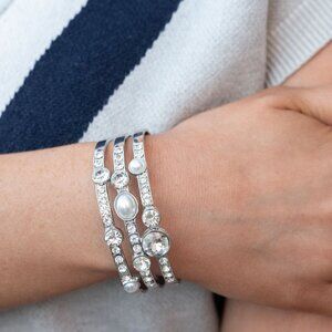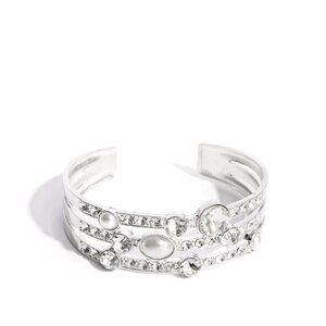 Three white rhinestone-embellished shiny silver bands are sporadically sprinkled with glossy white pearls in various shapes and oversized glittery white gems in varying sizes as they gracefully arc across the wrist, creating an irresistibly elegant cuff.