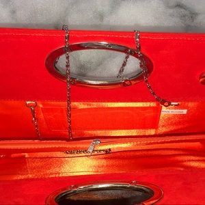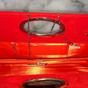 Has a place to hold the purse It has a chain for carrying it on the shoulder too Orange in color both outside and inside