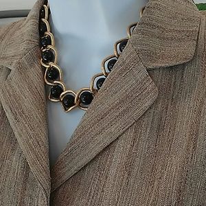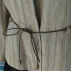 Beige/ Gold semi- striped jacket has linen look with 100% polyester easy care.( No wrinkles or ironing) Fully lined with beige polyester. However is dry clean only. Worn a couple of times only. Looks brand new. Tie belt is unusual.Leather like twist belt with brasstone ends. Hidden button front. Beautiful sums up the quality of this item.