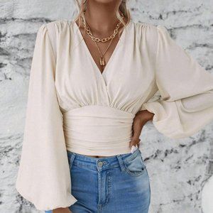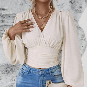 Classy Lantern Sleeve Ruched Blouse beige