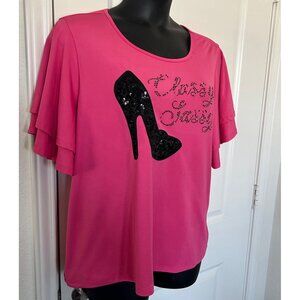 Classy Sassy Pink Top With Sequin Heel Graphic & Flutter Sleeves SIZE 22