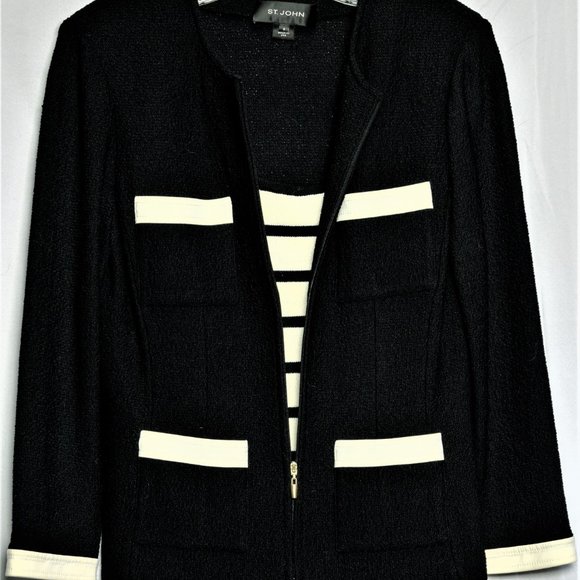 Excellent condition - no damage. Color is Black and Bright White. Zips up the front. Top is a St. John small.