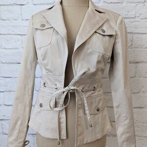 A perfect lightweight neutral tan/beige nicely tailored spring jacket by Cache. Easy versatile piece to