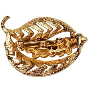 Vintage Classy Art Deco Gold Tone Leaf Pin Clear Rhinestones 1.5 in Retro Glam Unsigned.