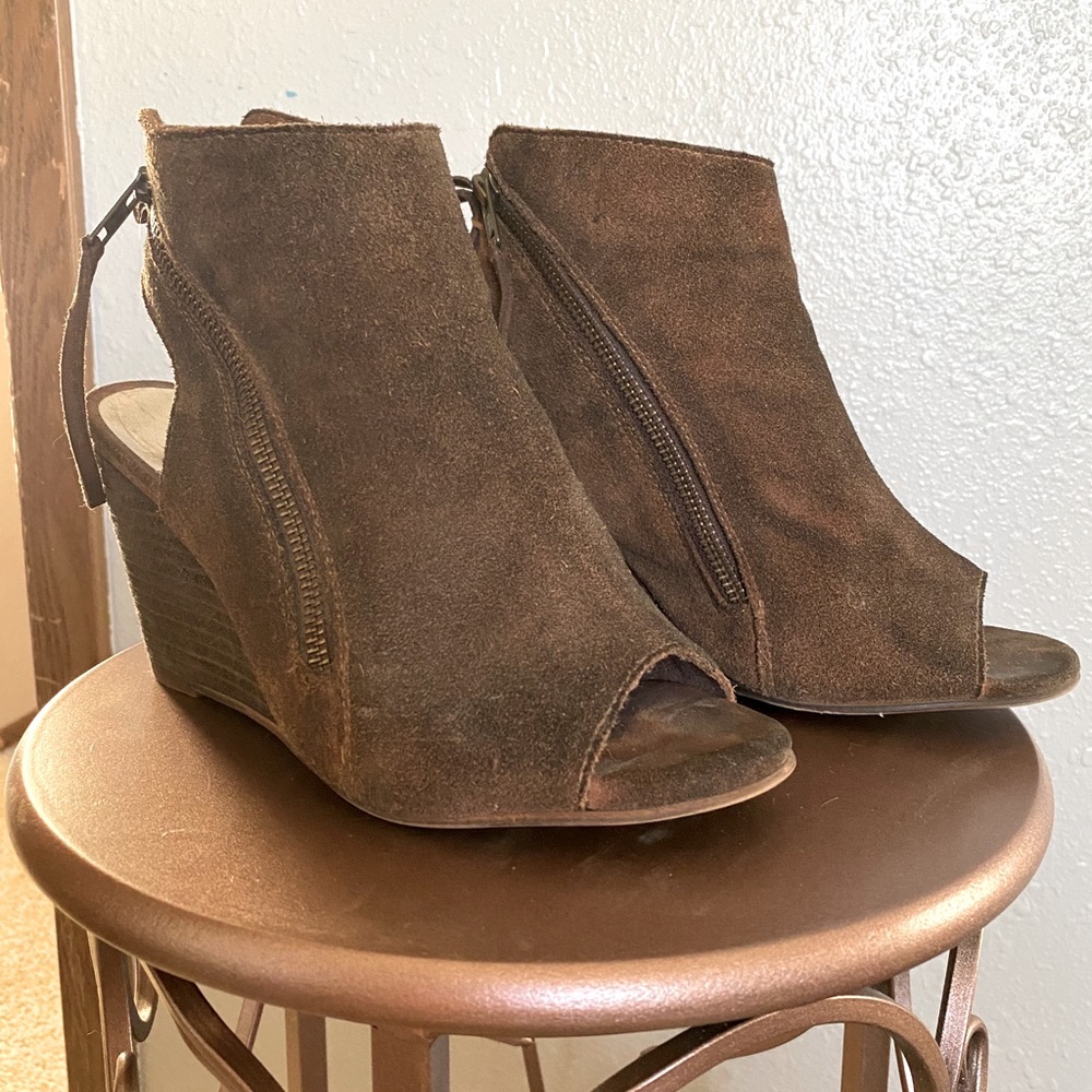 Brown wedges/heels. Only worn 1 or 2 times but have been sitting in my closet for over a year. Good condition, really comfortable! All zippers go up and down without any issues.
