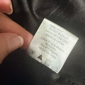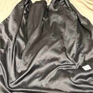 Beige polyester coat with black lining and trim. Silver zipper. Fashionable belted pieces around the cuffs. Very clean. Size medium.