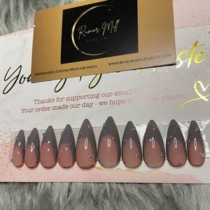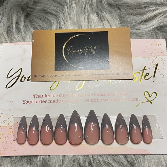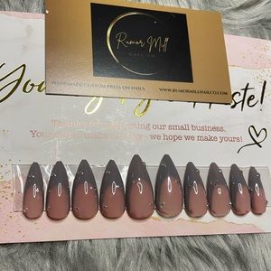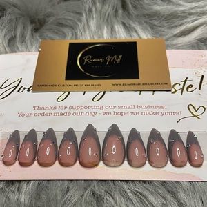 20pc press on nails, all handmade and gel polished. Every set come with adhesive tabs, 1 KDS brand glue(my personal fav), buffing block, alcohol wipes, and 1 glass nail file.